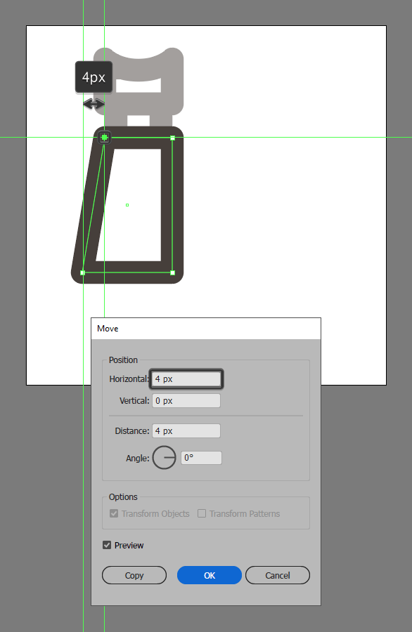 Инструментом Direct Selection/Прямое выделение (A) выделите левую верхнюю точку прямоугольника и переместите ее на 4 px вправо.