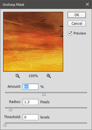 Создайте новый слой-копию всех видимых слоев. В меню выберите Filter > Sharpen > Unsharp Mask/Фильтр>Усиление резкости>Контурная резкость и настройте как показано ниже.