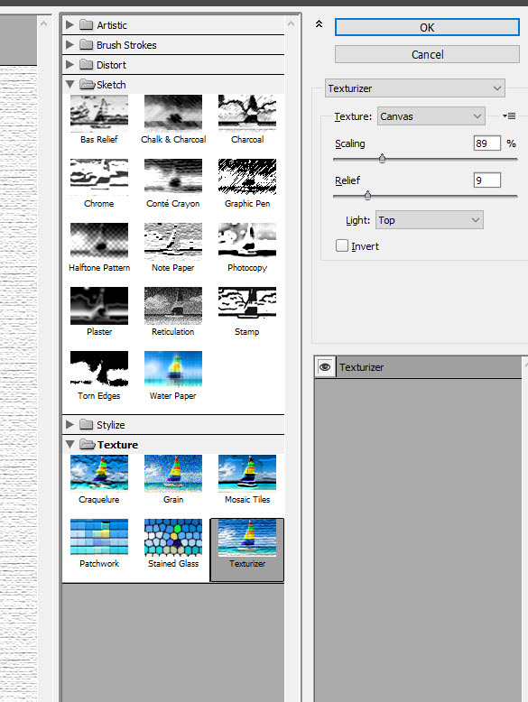 Теперь давайте добавим текстуры. Создайте новый слой поверх остальных (Ctrl + Shift + Alt + N) и залейте его белым цветом (Shift + F5). В меню выберите Filter > Filter Gallery/Фильтр>Галерея фильтров и используйте настройки как показано ниже.