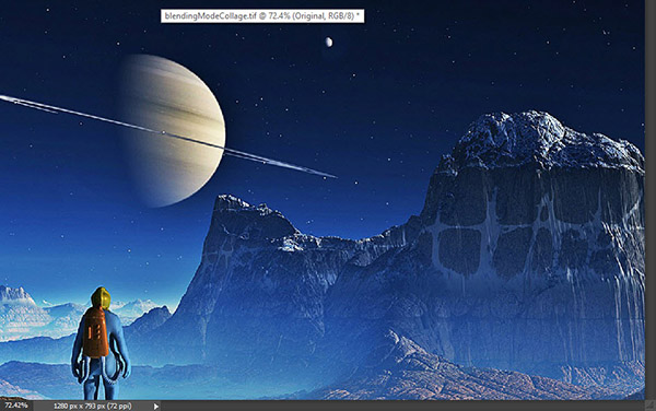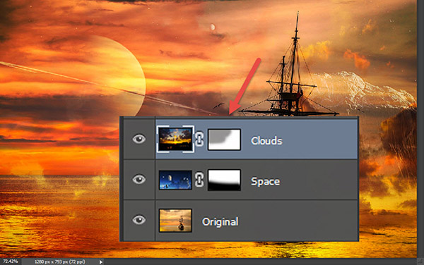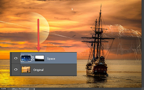 Мы не хотим, чтобы весь космический пейзаж был виден в нашей работе. Чтобы стереть лишнее можно использовать инструмент Eraser/Ластик, но это плохой способ редактирования изображения. Так мы стираем пиксельную информацию и лишаемся возможности позже внести изменения.