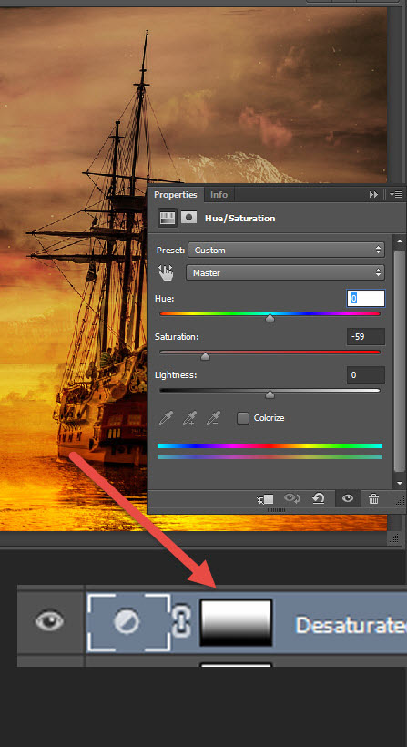 Теперь давайте частично снизим насыщенность цветов. Создайте новый корректирующий слой Hue/Saturation / Цветовой тон/Насыщенность (Layer > New Adjustment Layer > Hue/Saturation / Слой>Новый корректирующий слой>Цветовой тон/Насыщенность ). Укажите настройки как показано ниже. Затем при помощи черно-белого градиента скройте в маске этого слоя нижнюю часть.