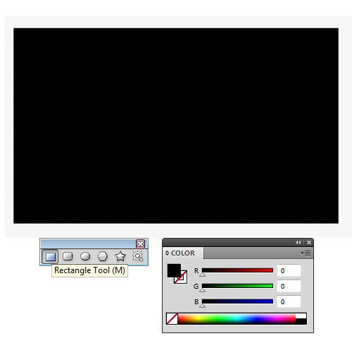 1. Создайте новый документ и укажите ему размер холста в 800 х 600 пикселей. Выберите инструмент Rectangle/Прямоугольник (M) и слева нарисуйте прямоугольник размером 800px на 480px. Укажите прямоугольнику чистый черный цвет заливки (R = 0 G = 0 B = 0).