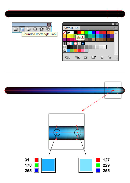 2. Возьмите инструмент Rounded Rectangle/Прямоугольник со скругленными углами и нарисуйте длинную и тонкую фигуру, размером примерно в 630 x 35px. Также укажите фигуре черный цвет заливки. Возьмите инструмент Mesh/Сетчатый градиент (U), кликните по фигуре и создайте меш-точки, как показано на картинке ниже. Раскрасьте их, ориентируясь на следующие изображения, используя инструмент Direct Selection/Прямое выделение (A).