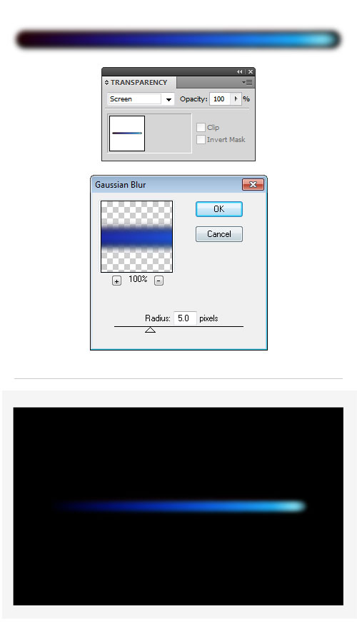 3. Убедитесь что фигура из предыдущего шага выделена. В меню выберите Effect > Blur > Gaussian Blur/Эффект>Размытие>Размытие по Гауссу. Укажите радиус размытия в 5px. Откройте палитру Transparency/Прозрачность и укажите фигуре Blending Mode/Режим наложения Screen/Осветление (Opacity/Непрозрачность 100%). Теперь разместите объект на черный фон.