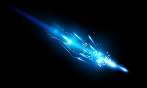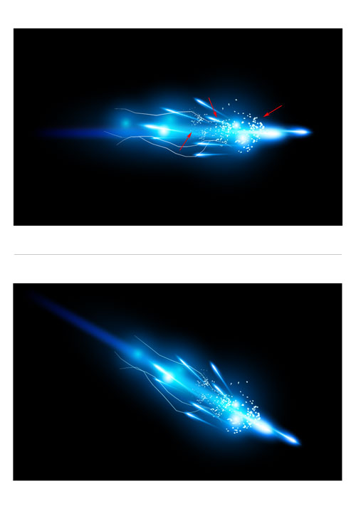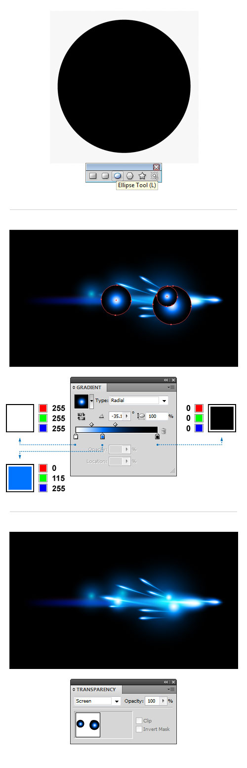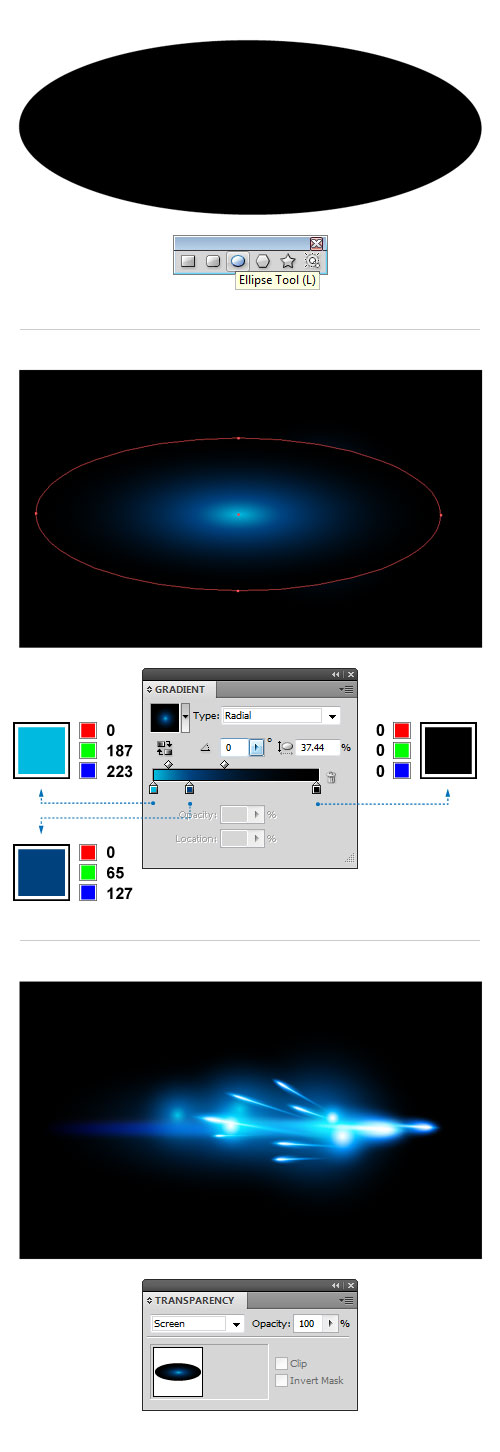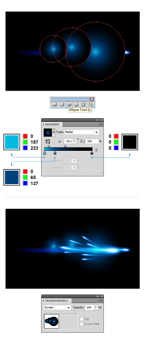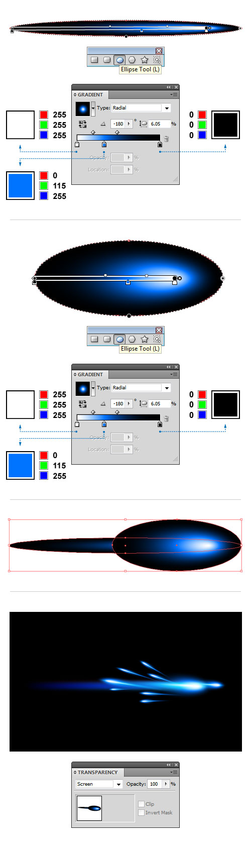 4. Возьмите инструмент Ellipse/Эллипс (L) и нарисуйте длинный и тонкий овал, размером примерно 450 x 30px. Откройте палитру Gradient/Градиент и залейте овал радиальным градиентом следующих цветов: белый (R=255 G=255 B=255), синий (R=0 G=115 B=255) и черный (R=0 G=0 B=0). Создайте еще один овал другой формы и укажите ему такой же градиент, что и предыдущему. Поместите второй овал поверх первого и сгруппируйте их (Ctrl+G). После этого сделайте несколько копий объектов и разместите их в хвосте кометы, как показано ниже. В палитре Transparency/Прозрачность смените Blending Mode/Режим наложения на Screen/Осветление (Opacity/Непрозрачность 100%).