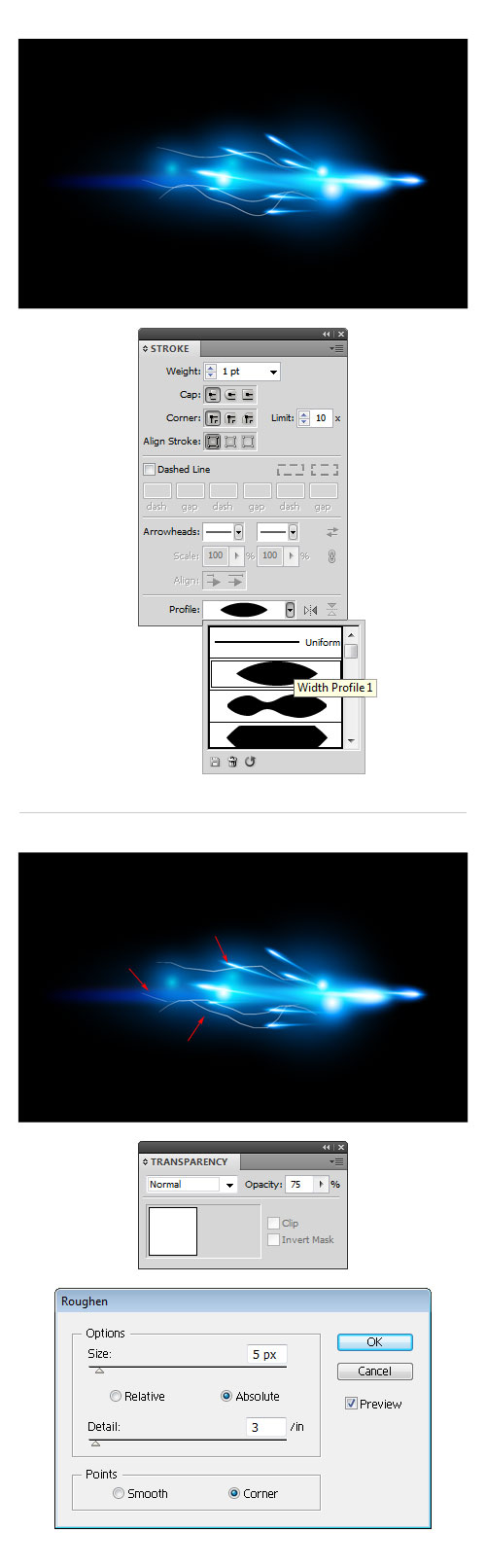 8. Выберите инструмент Paintbrush/Кисть (B) и нарисуйте несколько волнистых линий, как показано ниже. Выделите все нарисованные кистью линии и в палитре Stroke/Обводка выберите ‘Width Profile 1′. Укажите обводке белый цвет (R=255, G=255, B=255) и толщину в 1pt. В меню выберите Effect > Distort & Transform > Roughen/Эффект>Искажение и трансформация>Огрубление. Настройте эффект как показано ниже и нажмите OK. В палитре Transparency/Прозрачность снизьте параметр Оpacity/Непрозрачность до 75%.