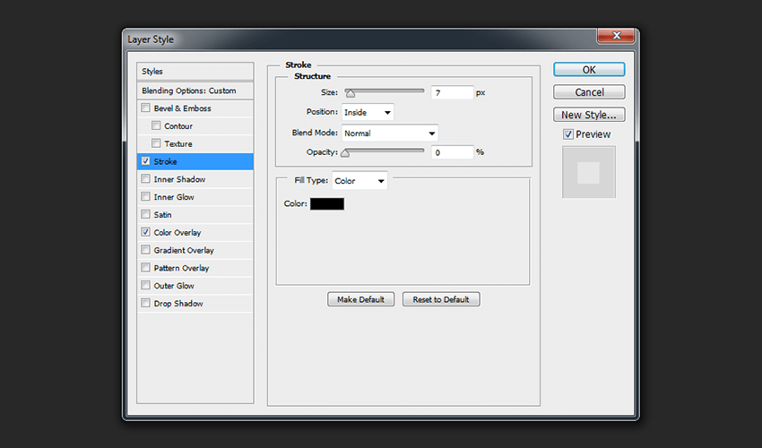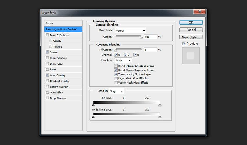 Укажите слою Front Fill/Заливку в 0%. Также укажите стили слоя, перечисленные ниже.