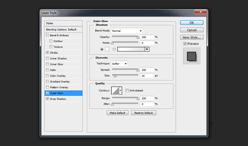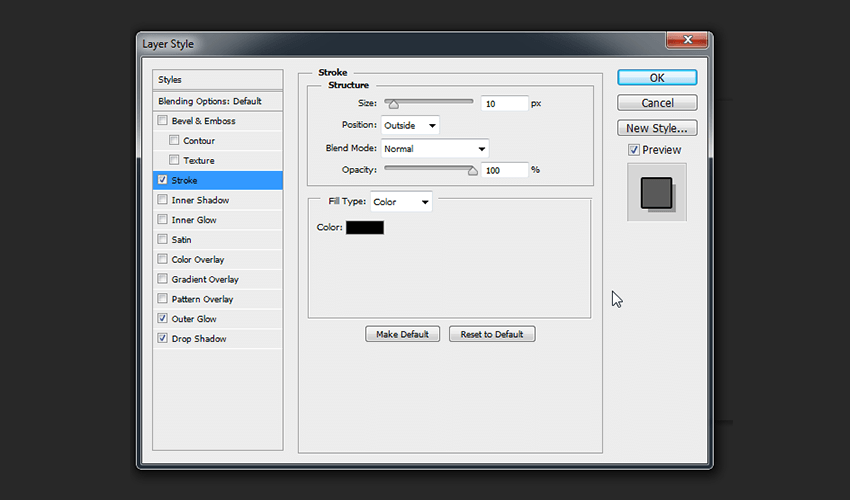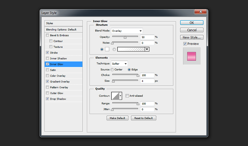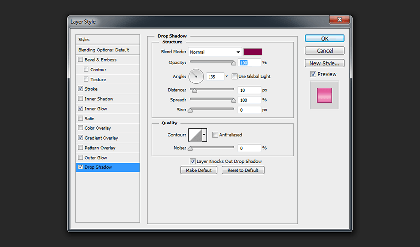 Кликните дважды по получившемуся слою, и укажите ему следующие стили.