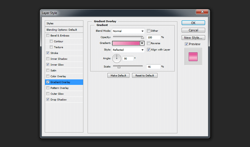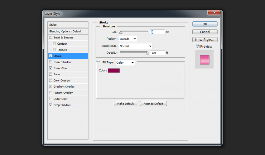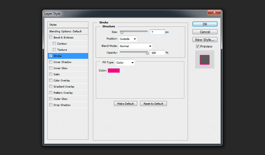 Укажите стиль слоя Stroke/Обводка с параметрами как показано ниже. (Цвет: #ff0084)