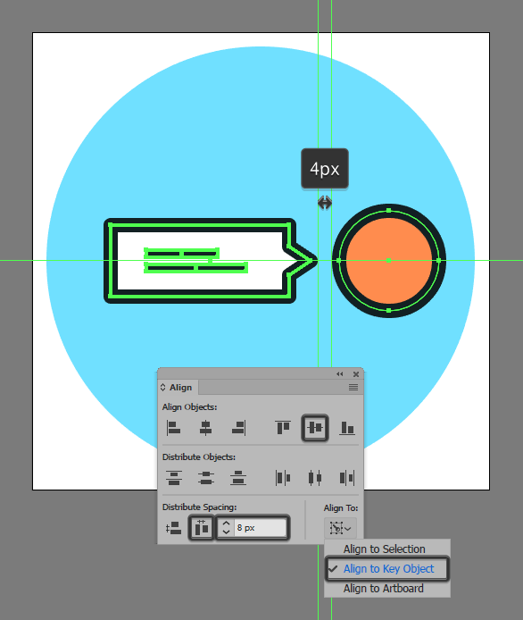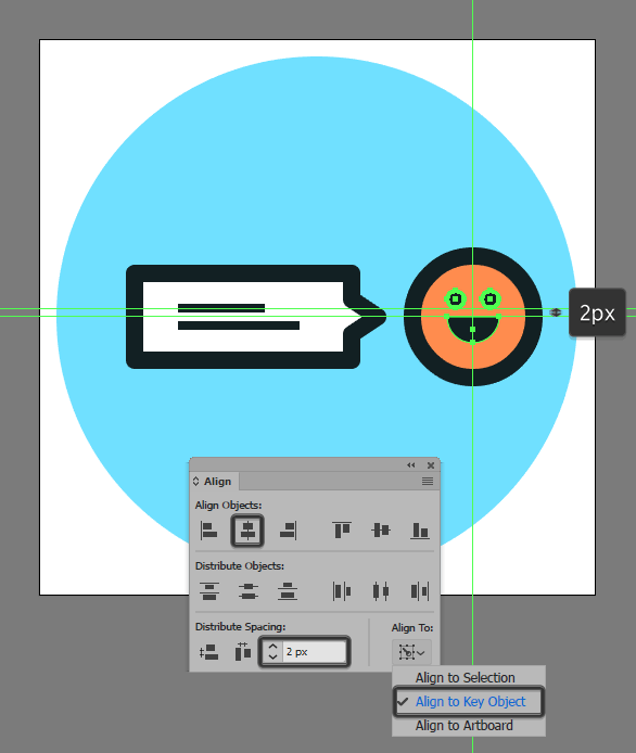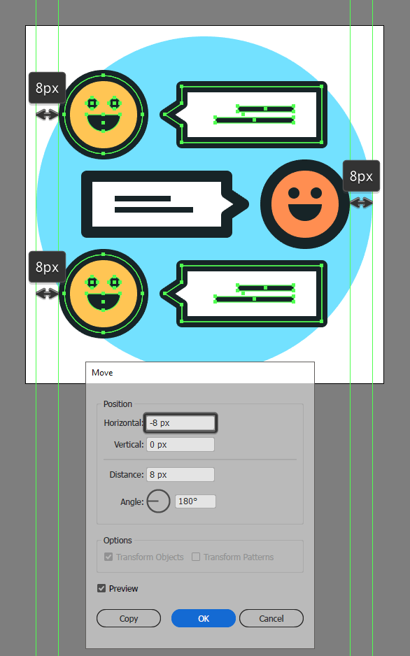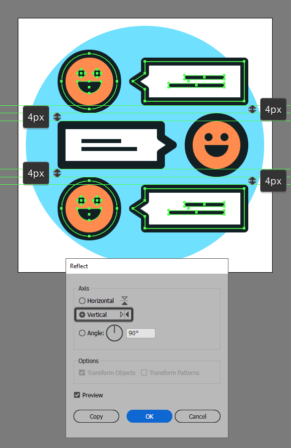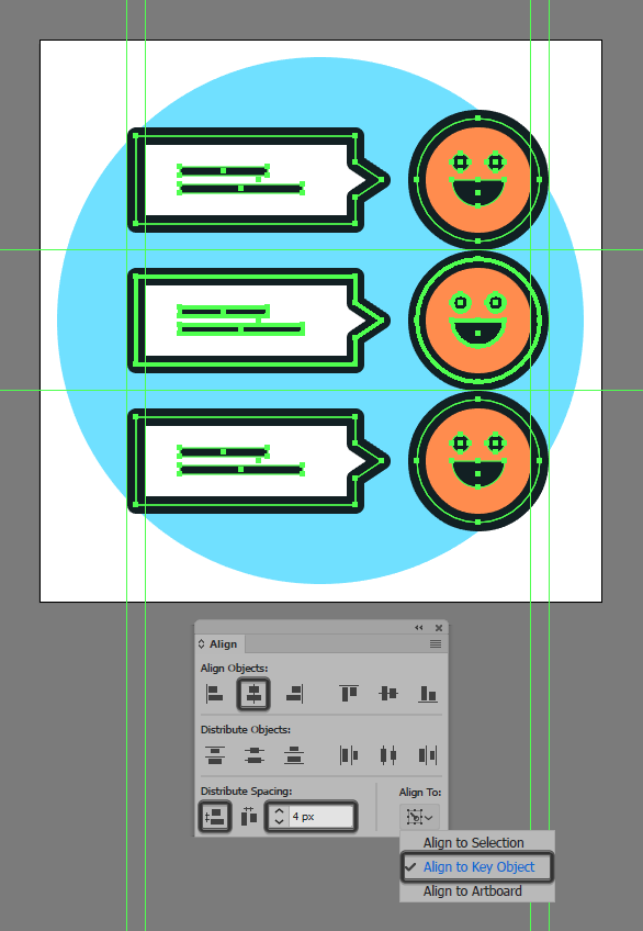 Создайте две копии смайликов с контейнерами (Control-C > Control-F). Выделите все три группы и распределите их на 4 px от оригинального объекта через палитру Align/Выравнивание.