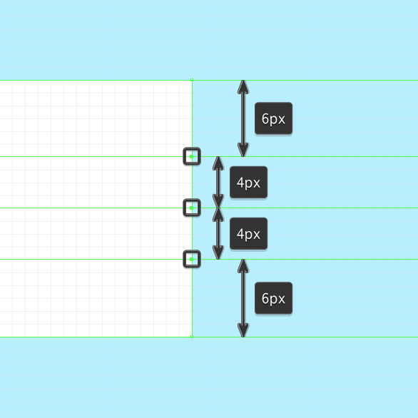 Отразите зеркально линии текста в верхнем контейнере. Теперь давайте заменим в последнем контейнере линии на точки. Удалите линии и нарисуйте три круга размером 4 x 4 px (цвет #0A1A1E) на расстоянии 2 px друг от друга. Сгруппируйте их (Control-G) и выровняйте по центру контейнера.