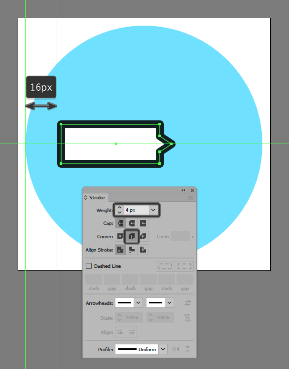 Укажите получившейся фигуре обводку цвета #0A1A1E, толщиной в 4 px, а также укажите обводке округлые углы в палитре Stroke/Обводка.