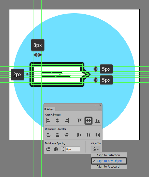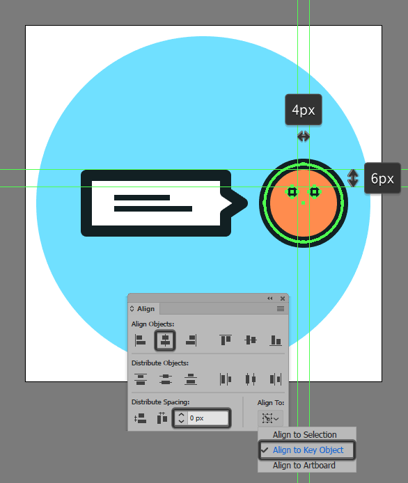 Рисуем глаза при помощи двух кругов размером 4 x 4 px (цвет #0A1A1E), на расстоянии в 4 px друг от друга. Выделите оба глаза и сгруппируйте их (Control-G), затем выровняйте группу глаз по центру относительно круга и разместите ее на 6 px ниже верхнего края круга.