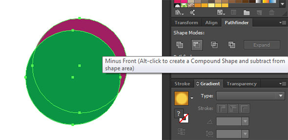 Инструментом Ellipse/Эллипс нарисуйте круг любого цвета, которого нет в вашей работе (в примере сиреневый). Дублируйте круг дважды. Для этого нажмите Ctrl+C (скопировать фигуру) и дважды Ctrl+F (вставить на передний план). Сместите немного вниз и влево верхний круг. Выделите верхний (смещенный) круг и тот что находится под ним. В палитре Pathfinder/Обработка контура нажмите на иконку Minus Front/Минус верхний.