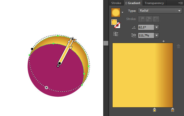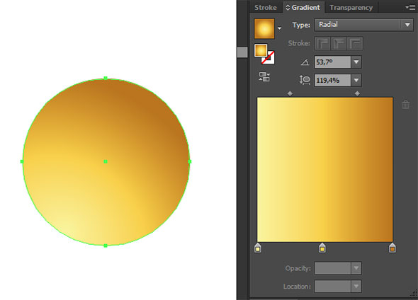 Укажите фигуре, которая образовалась в результате радиальный градиент цветов #F8CF4A и #BA741E. При помощи инструмента Gradient/Градиент отредактируйте градиент как показано на картинке ниже. После этого сгруппируйте (Ctrl+G) фигуру и круг под ним.