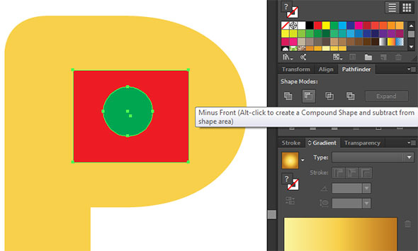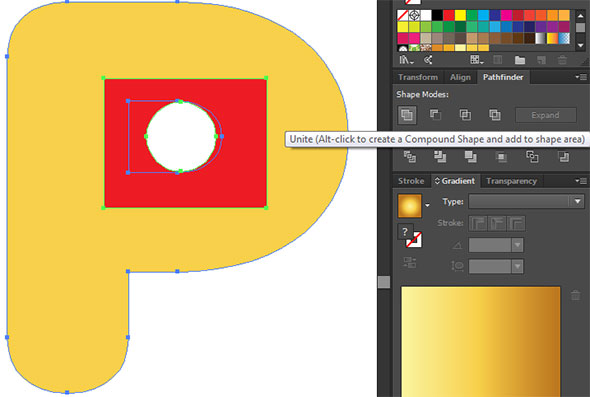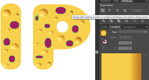 Выделите букву и прямоугольник с дыркой. В той же палитре выберите кнопку Unite/Объединить. Буква унаследует цвет прямоугольника. Верните ей первоначальный желтый. Сделайте то же с остальными буквами, которым требуются круглые отверстия.