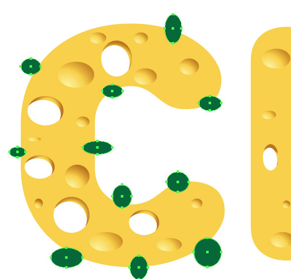 Снимите выделения с круга, возьмите инструмент Ellipse/Эллипс. Все эллипсы, которые вы будете рисовать сейчас автоматически будут окрашиваться в только что созданный нами градиент. Поэтому смело начинайте рисовать эллипсы на сырных буквах.