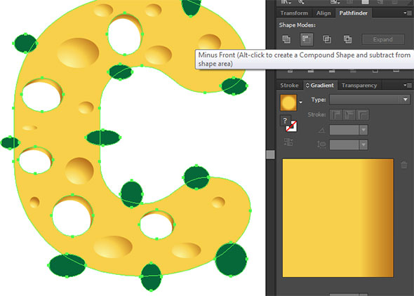 Выделите текст, копируйте его (Ctrl+C) и вставьте на задний план (Ctrl+B). При помощи стрелок на клавиатуре переместите копию текста немного ниже и левее. Теперь укажите копии градиент как у отверстий сыра, только линейный. При помощи инструмента Gradient/Градиент растяните градиент сверху вниз так, чтобы в нижней части был более темный цвет. Вот и всё!