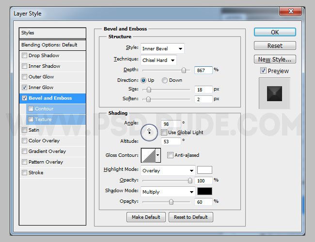 Укажите слою Shape 1 стиль слоя Bevel and Emboss/Тиснение.