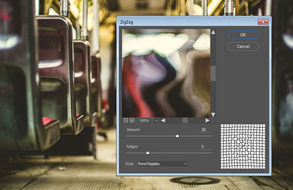 Откройте изображение автобуса изнутри (Bus Seats), в меню выберите Filter > Distort > ZigZag/Фильтр>Искажение>Зигзаг. Настройте фильтр как показано ниже.