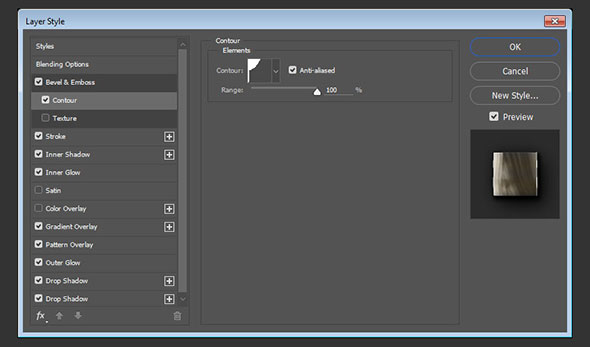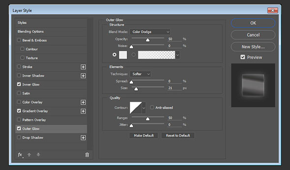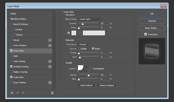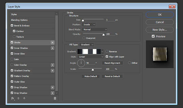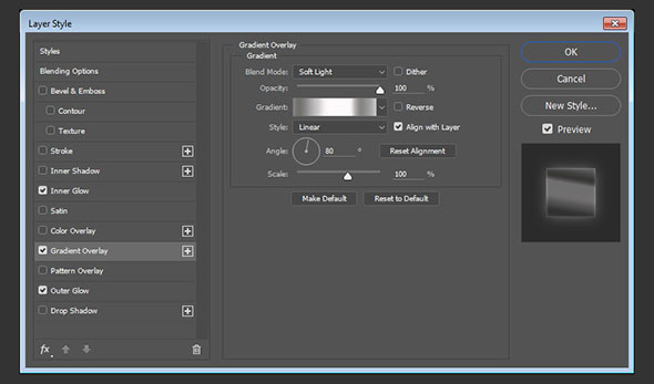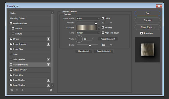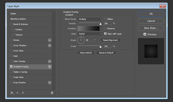 Кликните дважды по иконке слоя, чтобы открыть стили слоя, и выберите Gradient Overlay/Перекрытие градиента. Настройте стиль как показано ниже. В качестве градиента используйте переход цвета от #757575 к #0f0f0f.
