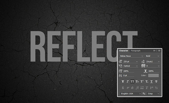 Создайте текст, используя шрифт Bebas Neue Bold размером в 220 pt. Также настройте Kerning/Кернинг на Optical/Оптический.