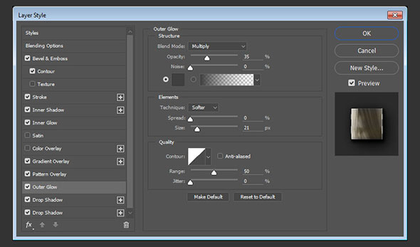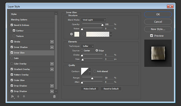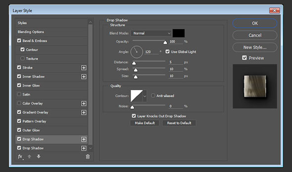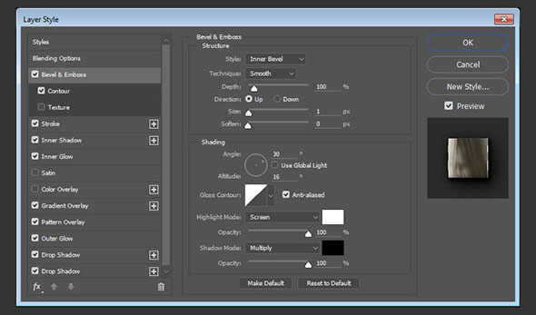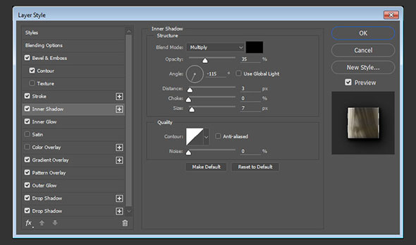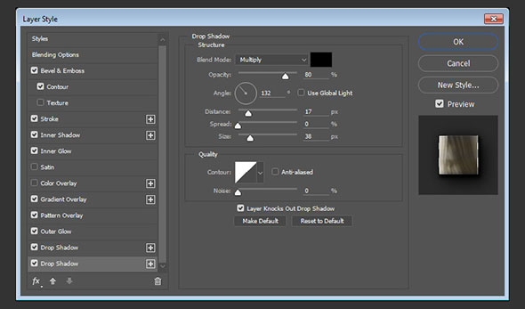 Кликните дважды по иконке оригинального слоя с текстом, и укажите ему стили слоя, указанные ниже с теми же параметрами что на скриншотах: