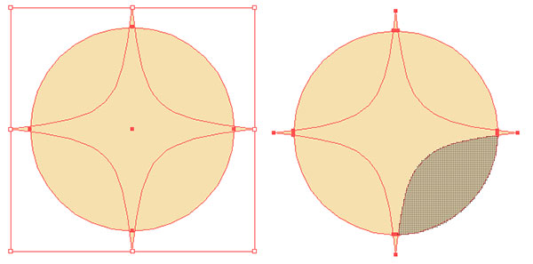 Выделите обе фигуры — круг и созданную в прошлом шаге. Инструментом Shape Builder/Создание фигур (Shift-M) разделите каждую из секций. Фигуры из центра круга а также за его пределами должны быть удалены (Delete).