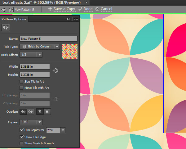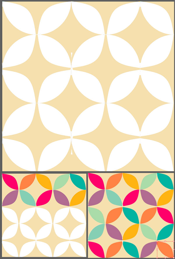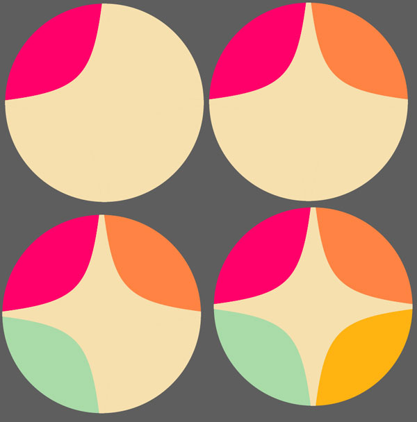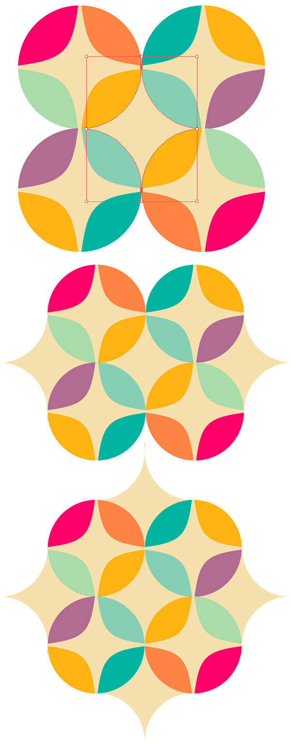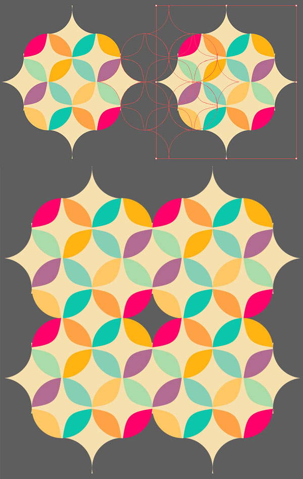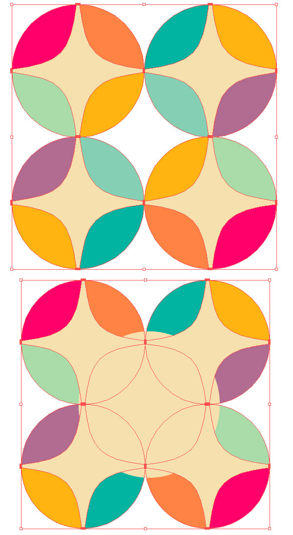 Дублируйте круги с оформлением три раза и разместите их в узор как показано ниже. Это приведет к образованию посредине скругленного квадрата, который делает дизайн еще интереснее. Однако если вы хотите избежать этого, вы можете иначе настроить параметры втягивания в Шаге 1. Поэкспериментируйте с параметрами цветов и сделайте серединку кремового цвета. Для этого нарисуйте большой круг, покрывающий прореху и выделите центр инструментом Shape Builder/Создание фигур.
