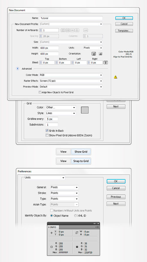 Создаем новый документ (Command + N)  600 х 600px и открываем расширенные (Advanced) настройки. Выбираем RGB, Screen (72ppi). Перед нажатием кнопки ОК убедимся, что отметка “Align New Objects to Pixel Grid” снята. Отображаем сетку (View > Show Grid) и фиксируем ее (View > Snap to Grid). Сетка нужна через каждые 5px — идем Edit > Preferences > Guides > Grid. Вводим «5» в поле «Gridline every» и «1» в поле «Subdivisions». Нужно также открыть панель Info (Window > Info) для просмотра превью с размером и позицией нашей формы. Не забывайте устанавливать единицу измерения в пикселях - Edit > Preferences > Unit > General. Все эти настройки значительно увеличат скорость работы.