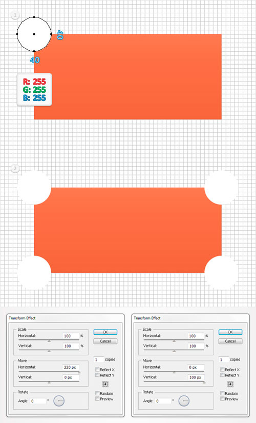 Переключаемся на инструмент Ellipse (L) и создаем круг в 40px. Заполняем белым цветом. Помещаем его в то место, как указано на первом рисунке и идем Effect > Distort & Transform > Transform. Вводим настройки, которые показаны в левом окне изображения ниже, нажимаем OK и идем снова Effect > Distort & Transform > Transform. Вводим данные, которые указаны в правом окне на изображении ниже и нажимаем OK.