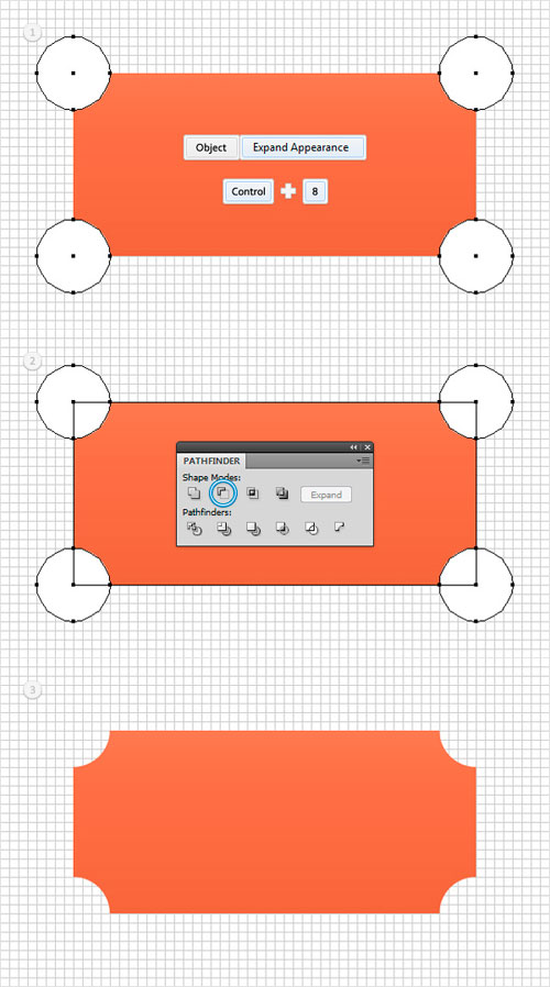 Убедитесь, что белые круги все еще выбраны. Идем Object > Expand Appearance. Выбираем группу данных форм и нажимаем Control + 8 (или же идем Object > Compound Path > Make) для того, чтобы объединить все в один канал. Выбираем канал вместе с прямоугольником и открываем панель Pathfinder (Window > Pathfinder) и отмечаем Minus Front button. Фокусируемся на панели Layers (слои) - Window > Layers, дважды щелкаем на поле имени и называем слой “ticket”.