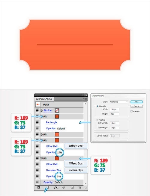 Убедитесь, что слой “ticket” выбран. Открываем панель Appearance (Window > Appearance) и добавляем второе заполнение, используя кнопку «Add New Fill» (отмечено голубой маленькой стрелочкой на изображении ниже). Выбираем это новое заполнение, устанавливаем цвет R=189 G=75 B=37 и идем Effect > Convert to Shape > Rectangle. Вводим свойства, которые показаны на изображении и нажимаем OK. Возвращаемся в панель Appearance и добавляем третье заполнение для формы “ticket”, используя ту же кнопку «Add New Fill». Выбираем это новое заполнение, устанавливаем цвет R=189 G=75 B=37, понижаем Opacity (прозрачность) к 5% и  идем Effect > Path > Offset Path. Вводим 2px для «Offset» и нажимаем OK. Добавляем четвертое заполнение. Цвет — R=189 G=75 B=37, понижаем прозрачность — 5% и идем Effect > Path > Offset Path. Вводим 5px для «Offset», нажимаем OK и идем Effect > Blur > Gaussian Blur. Вводим 3px для радиуса и нажимаем OK.