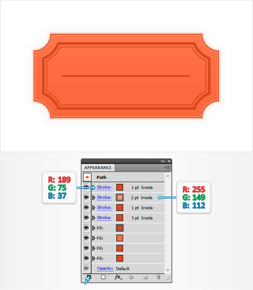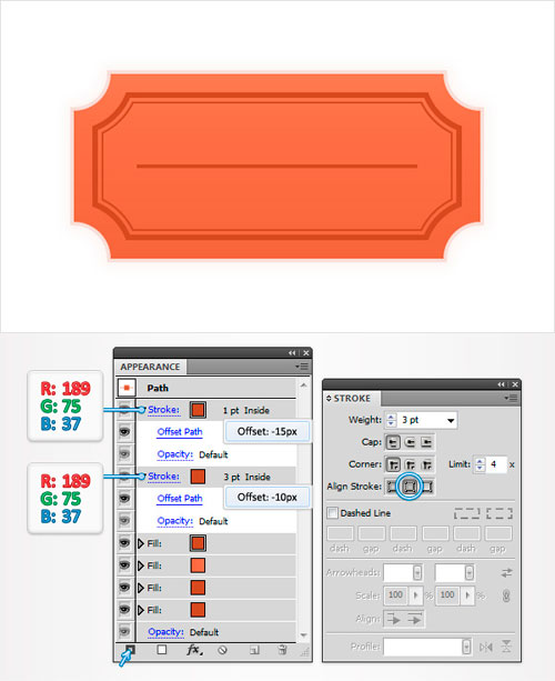 Убедитесь, что форма “ticket” все еще выбрана, фокусируемся на панели Appearance и добавляем штрих (Stroke) в 3pt. Выбираем и устанавливаем цвет R=189 G=75 B=37, выравнивание по центру внутри и идем Effect > Path > Offset Path. Вводим -10px «Offset» и нажимаем OK. Продолжаем фокусироваться на панели Аppearance и добавляем второй штрих (stroke) для нашей формы "ticket”, используя кнопку «Add New Stroke» (отмечена маленькой голубой стрелкой на изображении ниже). Выбираем и устанавливаем цвет R=189 G=75 B=37, делаем его шириной в 1pt, выравниваем по центру внутри и идем Effect > Path > Offset Path. Вводим -15px «Offset» и нажимаем ОK.