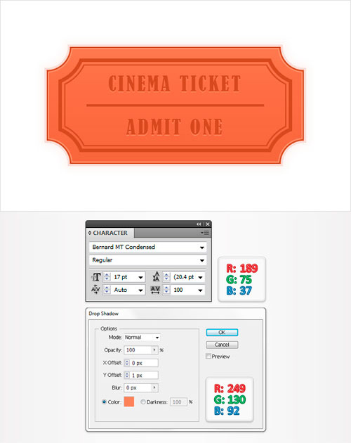 Используя инструмент Type (T), добавляем текст, который необходим. Устанавливаем цвет R=189 G=75 B=37 и добавляем эффект тени «Drop Shadow effect» (Effect > Stylize > Drop Shadow), как показано на изображении ниже.