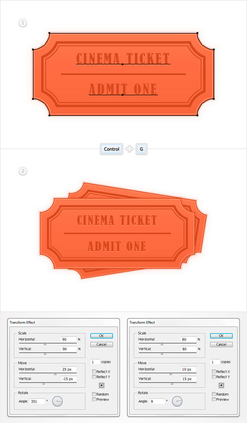 Выбираем текст и саму форму “ticket” и объединяем (CTRL + G). Выбираем эту новую группу и просто добавляем два эффекта трансформации, как показано на картинке ниже.