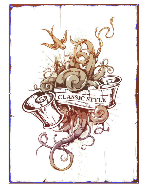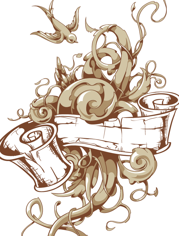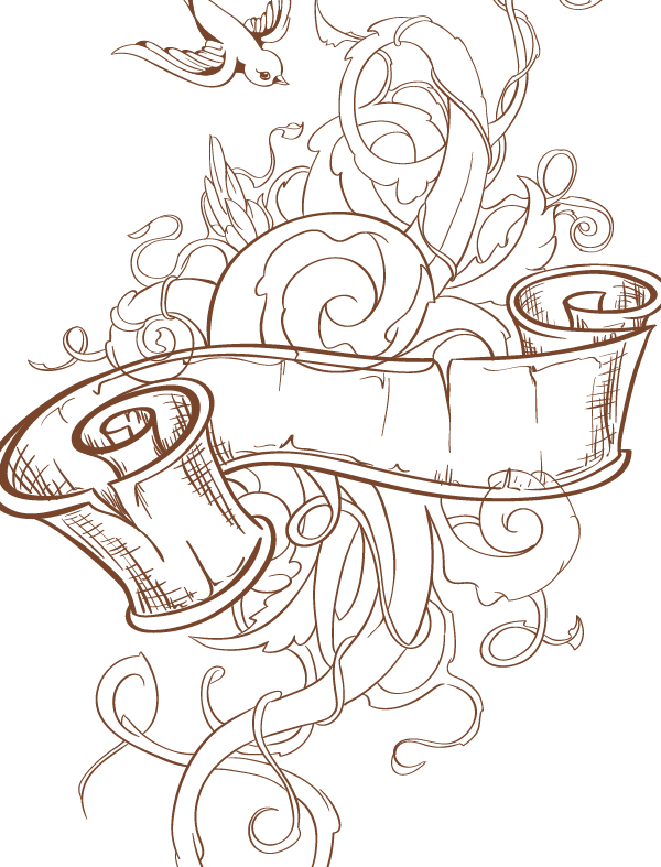 После завершения композиции добавляем цветочные завитки. Птица на изображении прибавляет нашей татуировке стиля старой школы. Она также уравновешивает наше изображение.