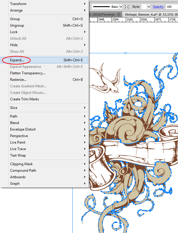 Перед тем, как закончить, выбираем все, что есть на этом слое, и идем Object > Expand.