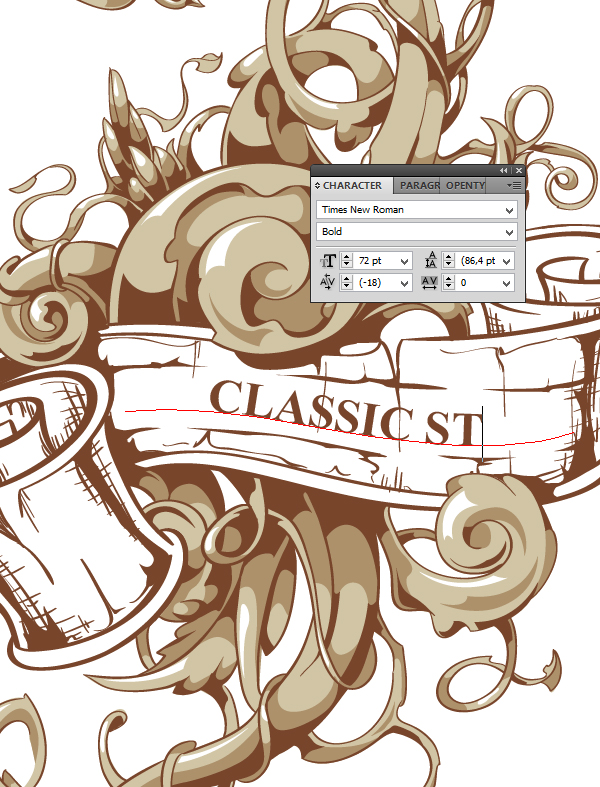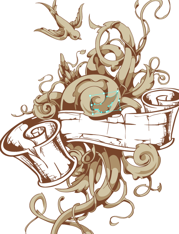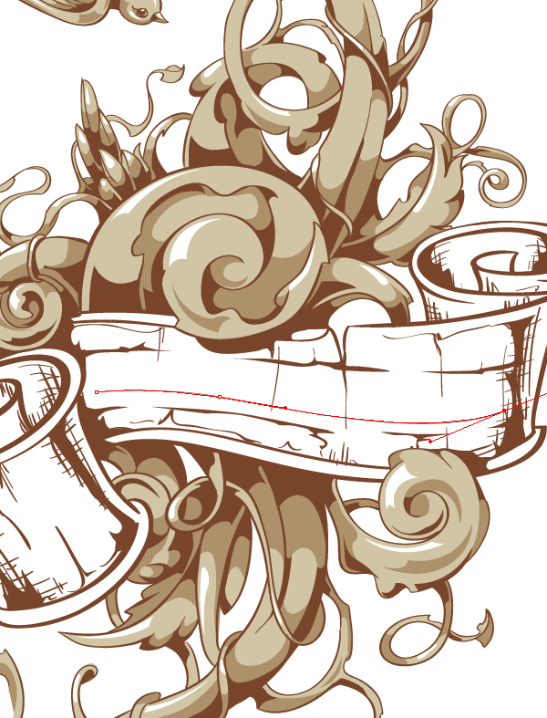 Когда вы закончили с контурами, пришло время добавить детали и тени. Следующим шагом будет добавление линий на завитую ленту, чтобы создать впечатление того, что лента как бы выгравирована. Используйте Calligraphic Brush с маленьким диаметром. Просто продублируйте вашу первую кисть и выберите диаметр в 1pt. Создаем новый слой, называем его «Scratches» и добавляем вертикальные и горизонтальные линии для добавления теней и эффекта гравюры.