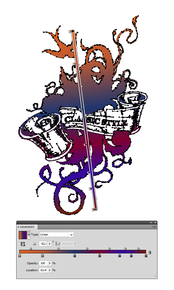 Кликните на кнопку Unite в панели Pathfinder для получения одного сплошного объекта. Заполните этот объект Линейным градиентом (Linear Gradient) (G). Тяните градиент с вершины к низу с небольшим наклоном и добавлением к градиенту следующих цветов: #DB611F; #B85736; #1F366E; #800030; #330AA3; #3F0E87; #791F00.