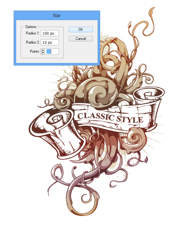 Добавляем немного декоративных элементов и фона на новом слое, который расположен снизу. Можем использовать кляксы чернил для добавления немного грязи в стиле гранж. Также добавим лучи на заднем плане, используя инструмент Star.