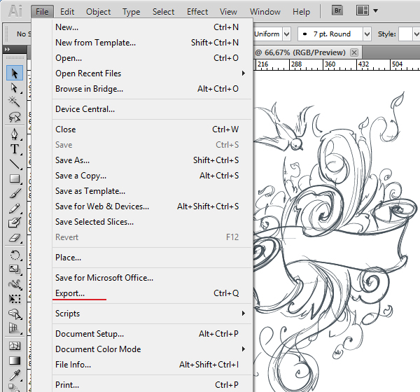 Когда набросок закончен, конвертируем его в формат JPG: File > Export.