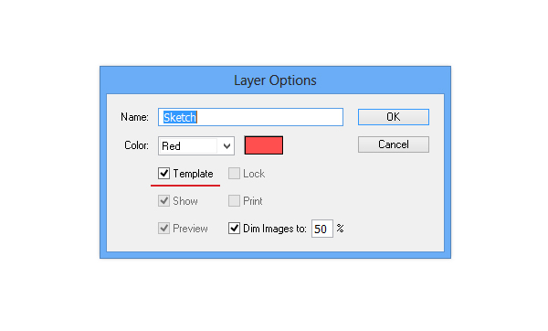 Создаем новый слой и помещаем его вниз панели слоев. Помещаем изображение с нашим эскизом на этот слой. Убедитесь, что слой, который вы создали, это Шаблон (Template), посмотреть это можно в Опциях слоев (Layer Options). Кликните дважды на панели слоя, переименуйте этот слой на «Эскиз».
