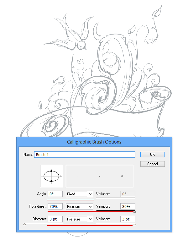 Теперь нам нужно создать новую Calligraphic Brush для того, чтобы создать гладкие контуры нашего дизайна. Давайте откроем панель Brushe (Кисти) в Window > Brushes. Выбираем Новая кисть (New Brush) — Каллиграфическая кисть (Calligraphic Brush). Используйте настройки, которые указаны ниже на изображении, и нажмите OK.