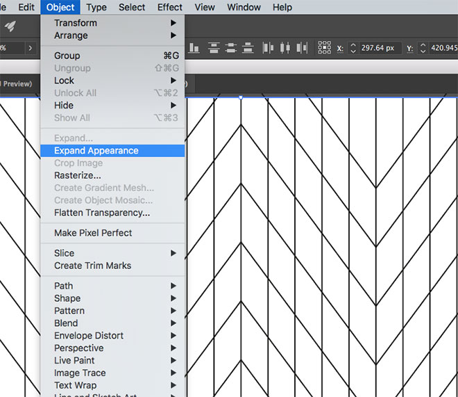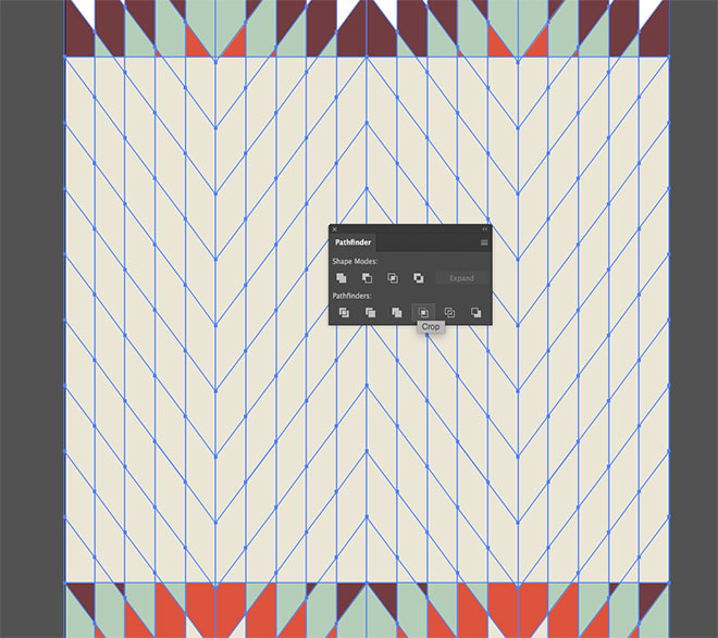 Можно сделать узор как образец. Для этого растяните прямоугольник поверх узора. Он должен начинаться и заканчиваться там, где начинается и заканчивается узор. Выделите узор и прямоугольник и кликните по иконке Crop/Кадрировать в палитре Pathfinder/Обработка контура.