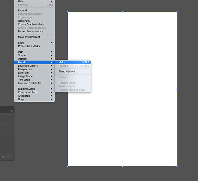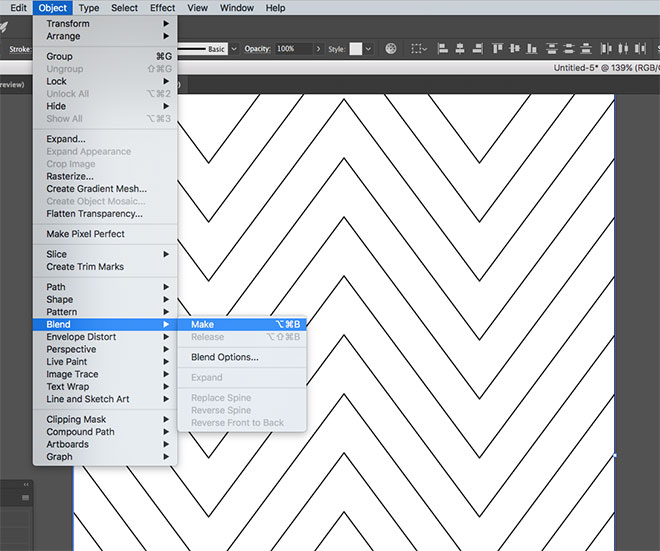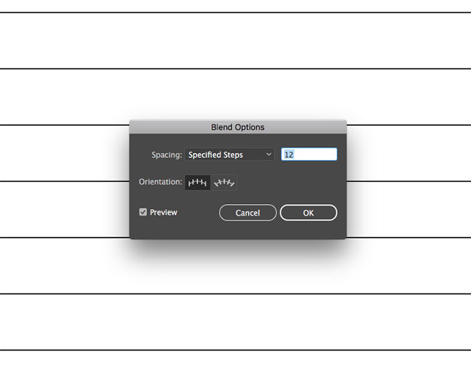 Снова возьмите инструмент Line/Отрезок линии, и нарисуйте две линии по правому и левому краям рабочей области. Выделите обе линии и выберите в меню Object > Blend > Make/Объект>Переход>Создать.