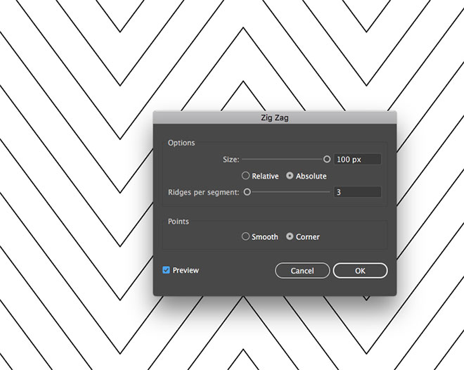 Включите опцию Preview/Просмотр и выберите такое количество шагов, чтобы вертикальные линии попадали в пики зигзагов. У нас получилось 19.
