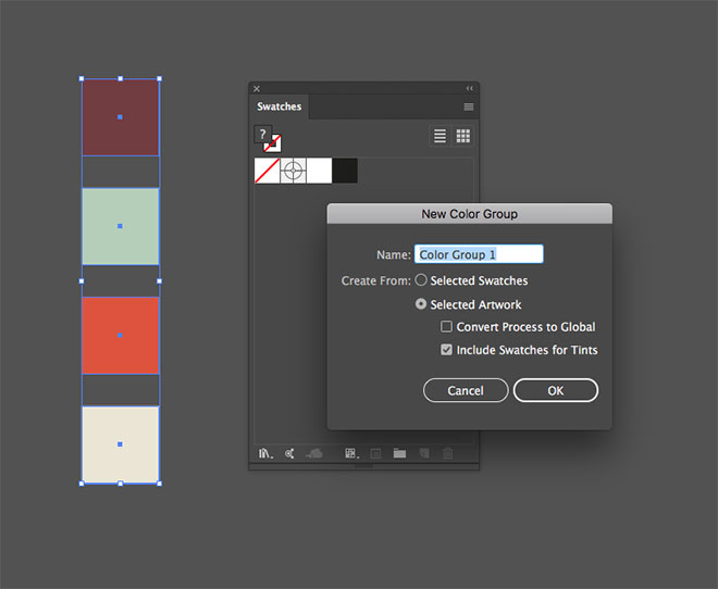 Где-нибудь в документе нарисуйте квадраты по количеству цветов в вашей палитре. Определите какие цвета хотите использовать и залейте ими квадраты. Выделите все квадраты и кликните по иконке New Color Group/Новая группа цветов в палитре Swatches/Образцы.