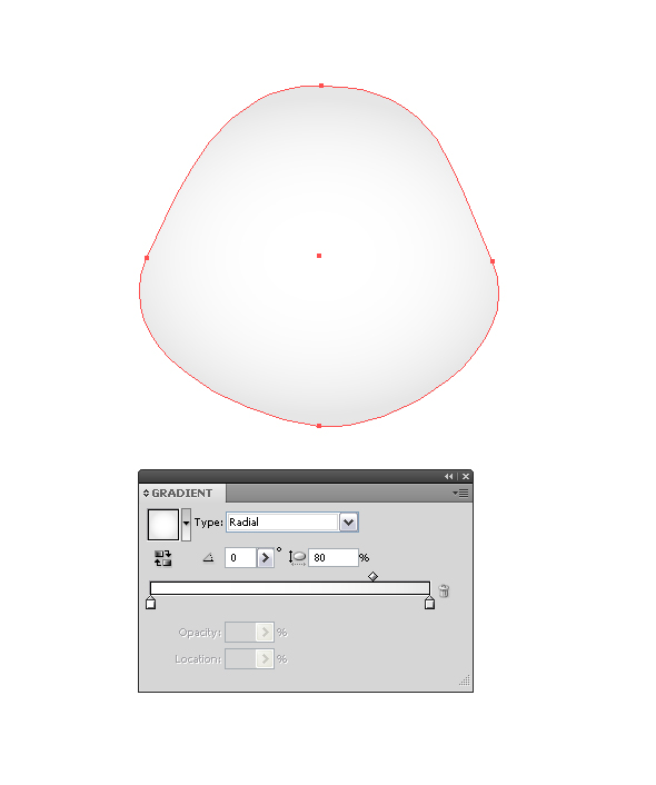 Нарисуйте круг при помощи инструмента Эллипс Ellipse tool (L) и немного измените его форму при помощи Direct Selection tool (A), добавьте ему радиальный градиент от белого к светло-серому, установив значения, которые показаны на скриншоте ниже: