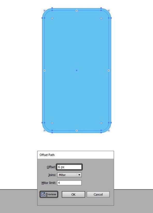 Создадим для этой фигуры контур. Для этого выделим ее и затем применим Object > Path > Offset Path / Объект > Контур > Создать параллельный контур и зададим 6 px в поле Offset / Смещение.